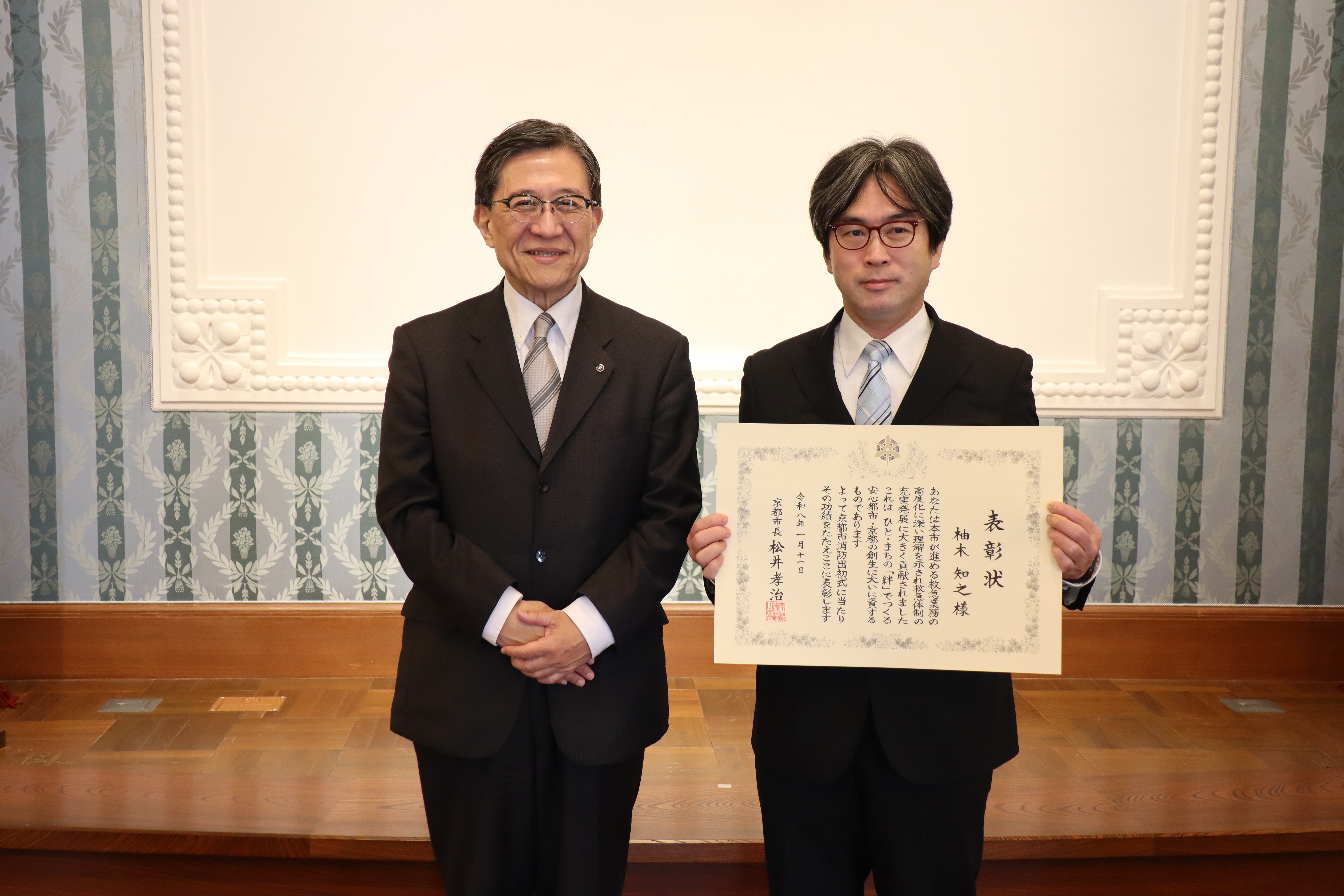 柚木知之 初期診療・救急科准教授(副診療科長・救命救急センター副センター長)が、メディカルコントロール・救急救命士教育など消防行政への貢献を高く評価され、松井孝治 京都市長より表彰を受けました。