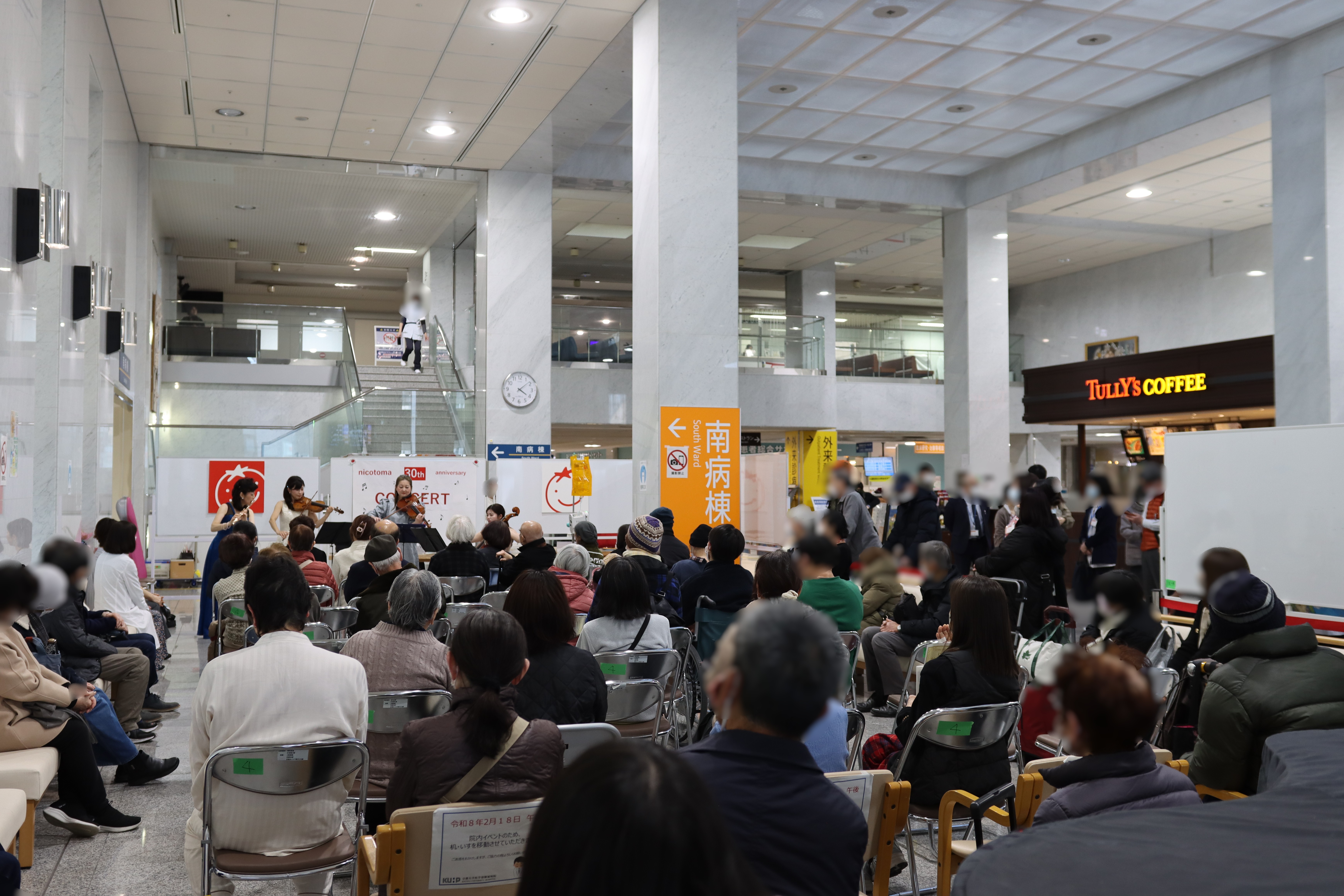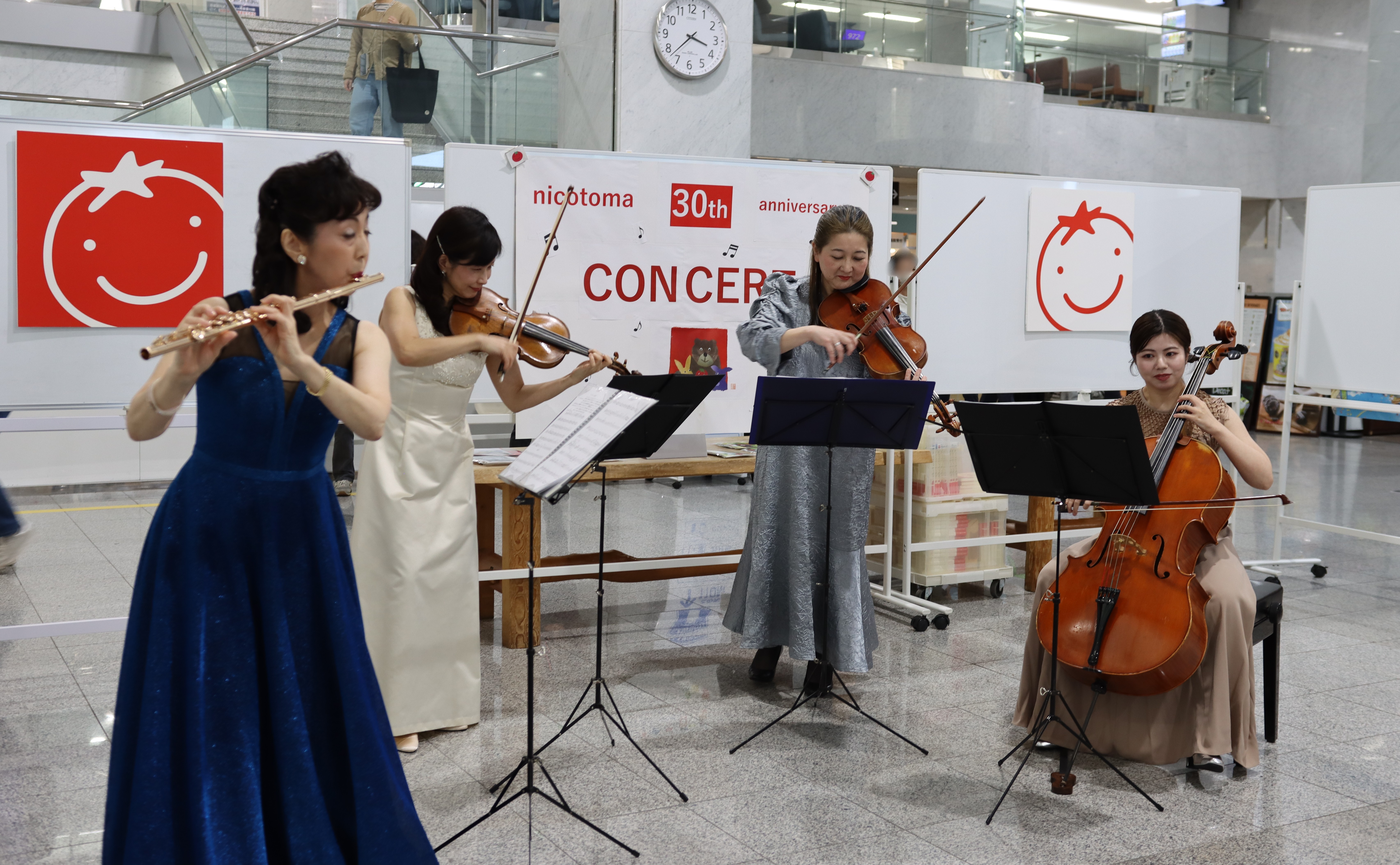 この節目を記念し、2026年2月18日(水)15:30~16:30、本院ウェルネスエリアにおいて、「にこにこトマト」30周年記念コンサートが開催されました。当日は京都カルテット様による演奏のほか、お祝いメッセージの紹介や活動内容の展示を行いました。